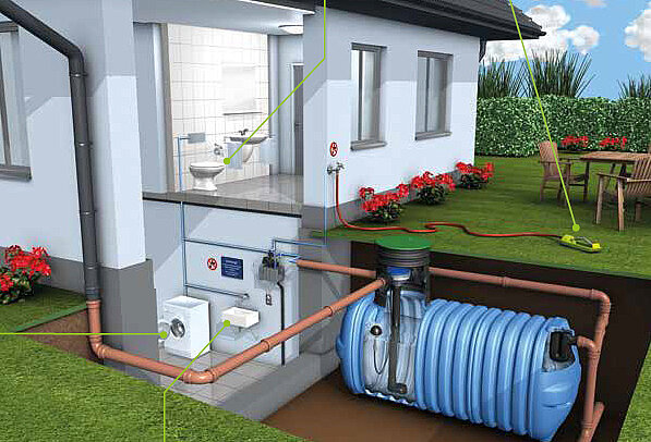 Das Leitungssystem für das Regenwasser ist von dem des Trinkwassers komplett getrennt. Das Prinzip: Das vom Dach über Leitungen in einen Speicher aufgefangene Wasser wird Ihnen durch ein Pumpensystem im Haus nutzbar gemacht, beispielsweise für die Toilettenspülung oder das Wäschewaschen.